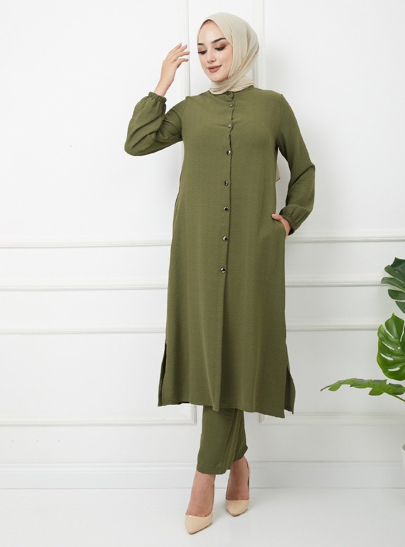 OLCAY TEKSTİL Haki Yandan Yırtmaçlı Sırtı Pilikaşe Detaylı Uzun Tunik & Pantolon İkili Takım