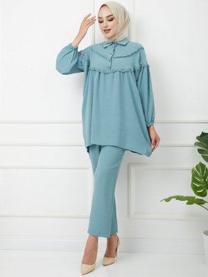 OLCAY TEKSTİL Mint Yeşili Robası Dantel Detaylı Pantolon & Tunik İkili Takım