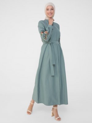 Refka Koyu Çağla Kolları Nakışlı Poplin Elbise