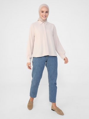 Refka Açık Bej Aerobin Gizli Patlı Arkası Uzun Bluz Gömlek