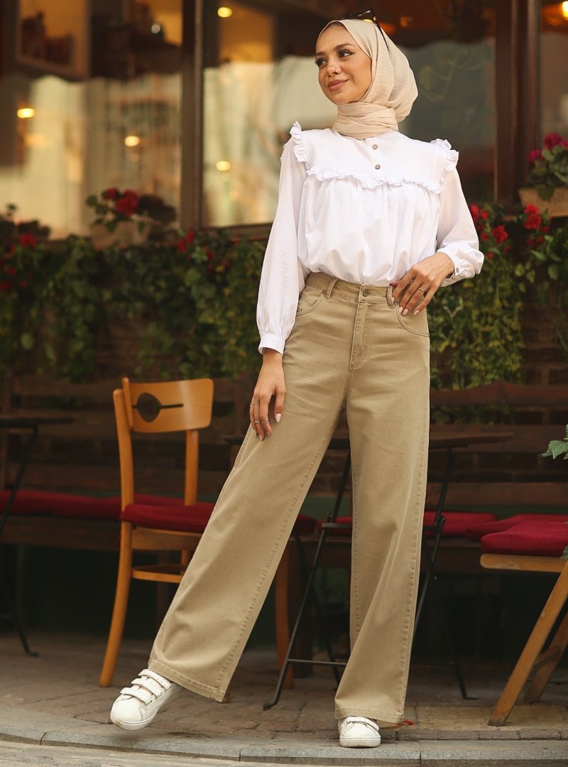 Neways Bej Geniş Paça Kot Pantolon