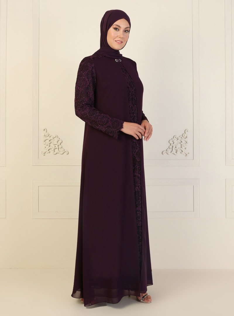 Sevdem Abiye Mor Dantel Detaylı Abiye Elbise