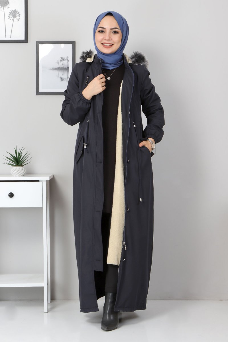 Tesettür Dünyası Beli Bağcıklı Kapaklı Mont Lacivert