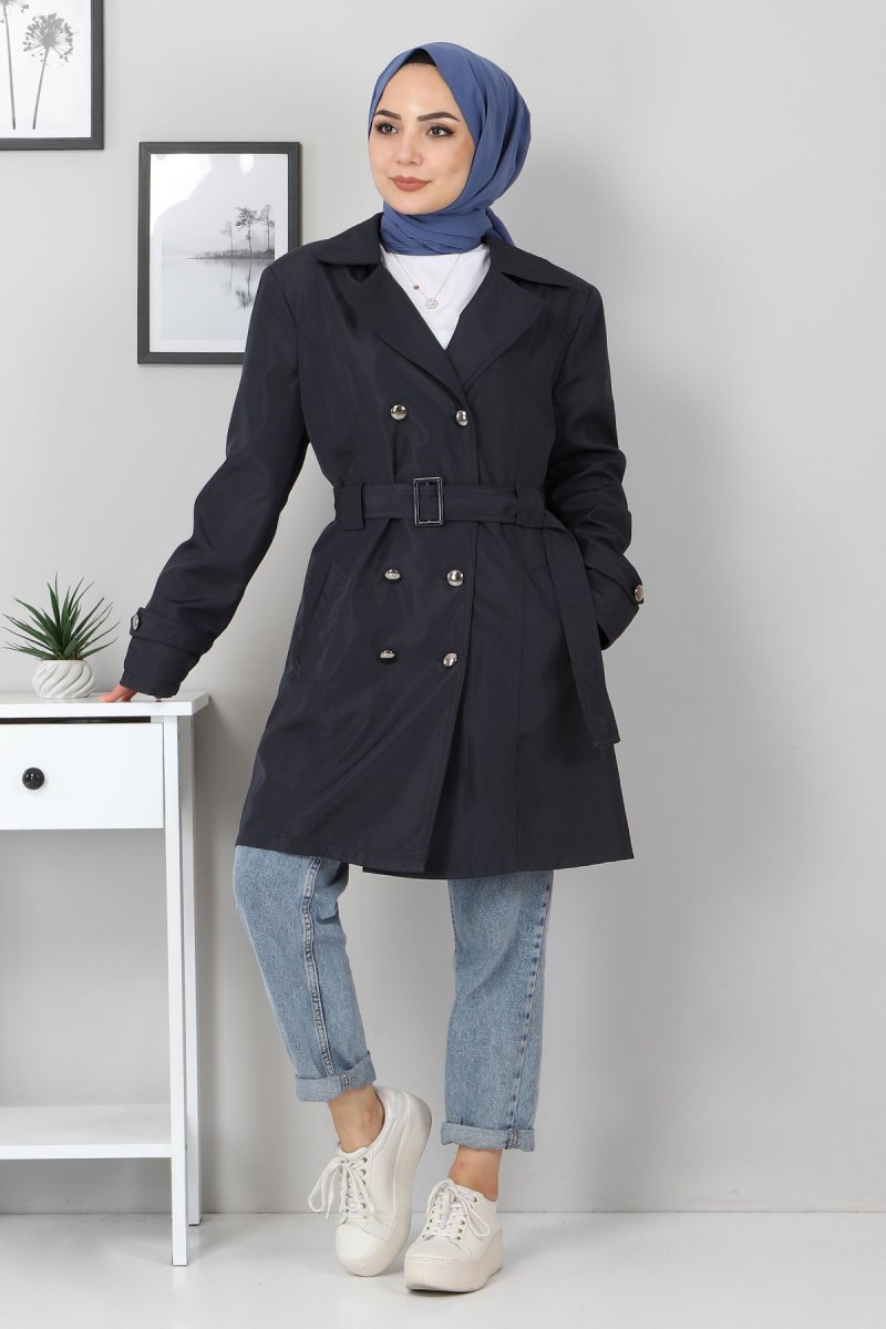 Tesettür Dünyası Kemerli Kısa Trençkot Lacivert