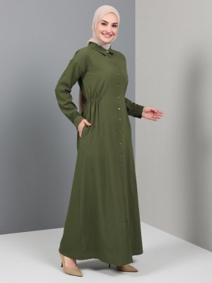 Tavin Haki Boydan Düğmeli Beli Lastikli Elbise