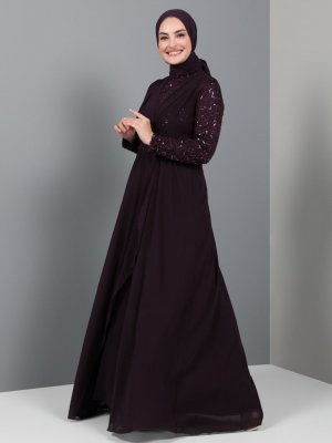 Tavin Mürdüm Pul Detaylı Kemerli Abiye Elbise