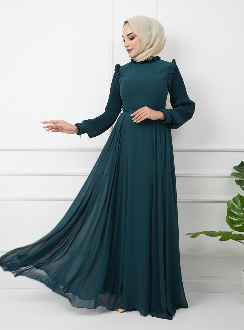 Olcay Koyu Yeşil Fırfır Detaylı Kolları Piliseli Abiye Elbise