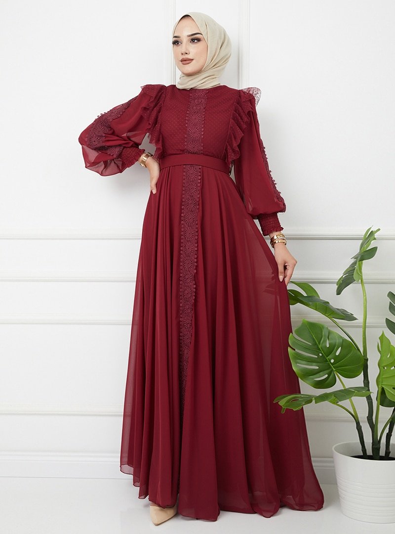 Olcay Bordo Fırfırlı Ve Dantel Şerit Detaylı Abiye Elbise