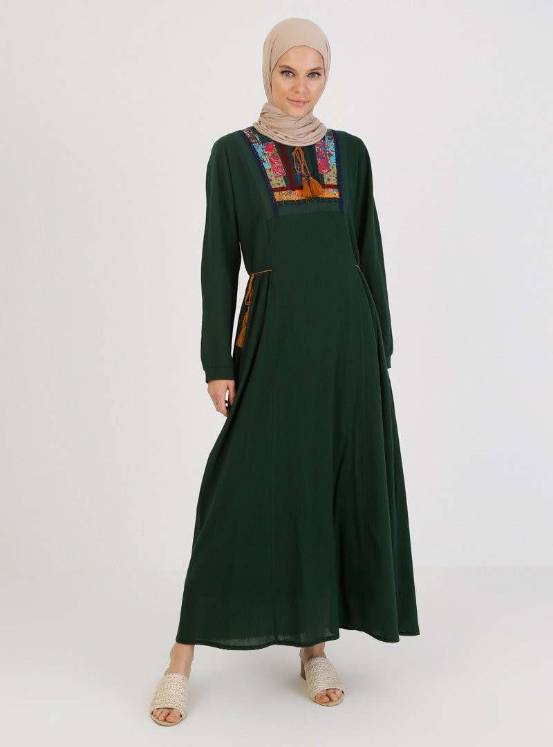 Elis Şile Bezi Yeşil Şile Bezi Nakış Detaylı Elbise