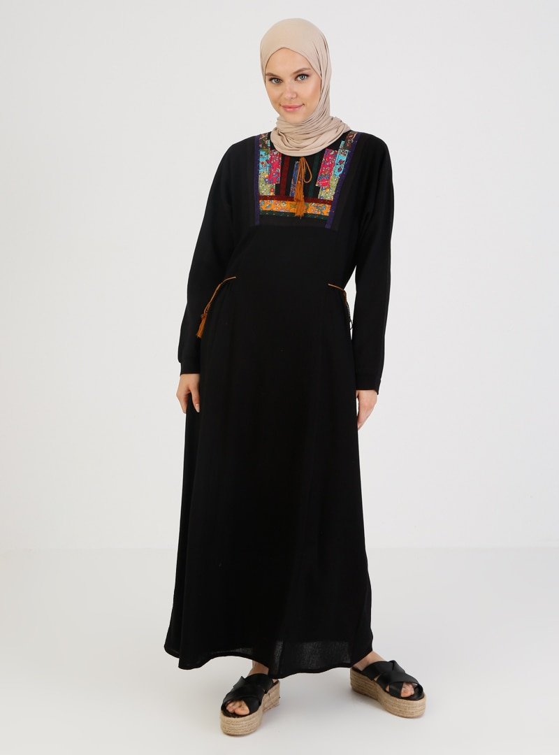 Elis Şile Bezi Siyah Şile Bezi Nakış Detaylı Elbise