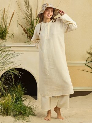 Ceylan Otantik Krem Müslin Düğmeli Uzun Tunik