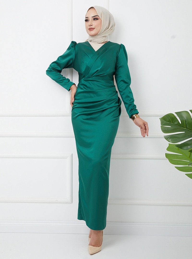 Olcay Yeşil V Yaka Pile Detaylı Saten Abiye Elbise