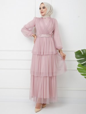 Olcay Pudra Kemeri Taş Detaylı Tüllü Kat Kat Abiye Elbise