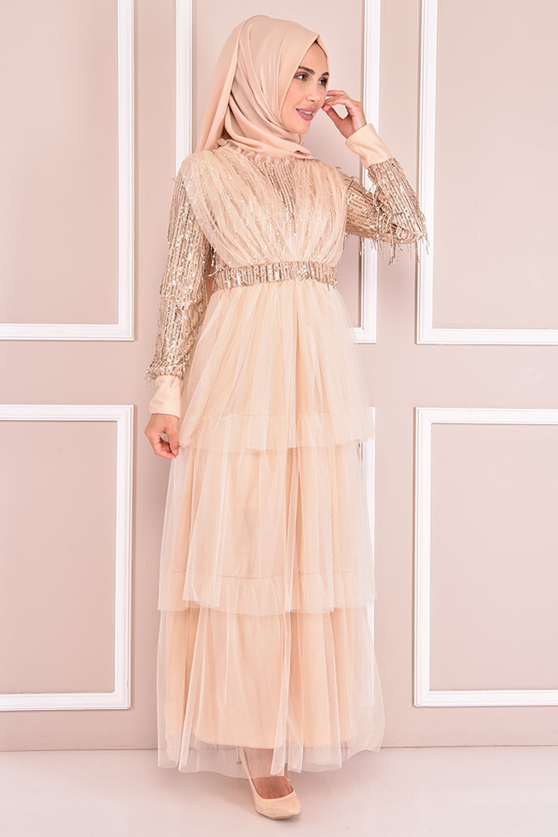 Moda Merve Krem Pullu Abiye Elbise