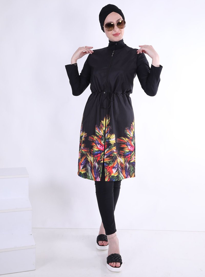 Ns Tasarım Tesettür Mayo Siyah Püskül Desen Paraşüt Kumaşyan Lü Mayo Takım