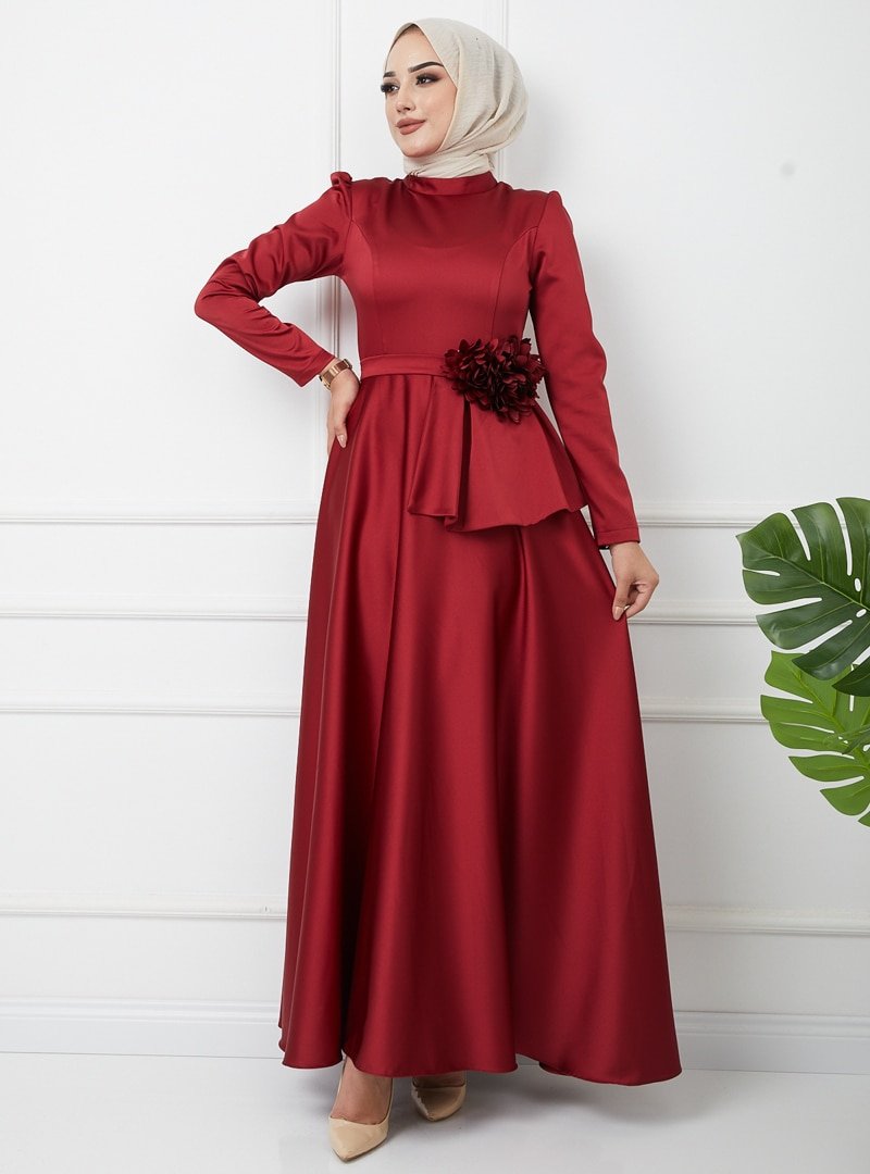 Olcay Bordo Çiçek Detaylı Beli Volanlı Saten Abiye Elbise