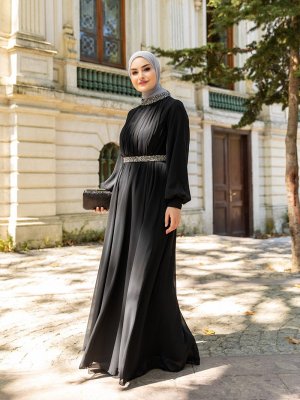 Tavin Siyah Yaka Detaylı Tüllü Abiye Elbise