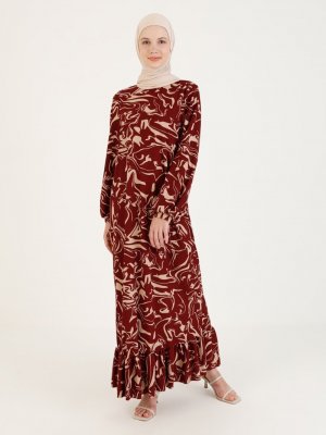 Moda Zenis Krem Bordo Etek Uçları Fırfırlı Desenli Elbise