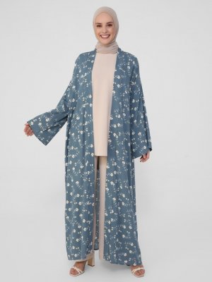 Refka Mavi Doğal Kumaşlı Çiçek Desenli Ferace