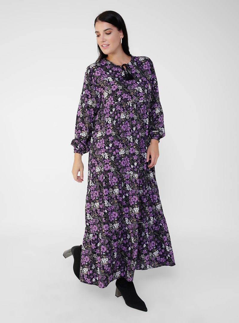 Alia Lila Büyük Beden Doğal Kumaşlı Çiçek Desenli Elbise