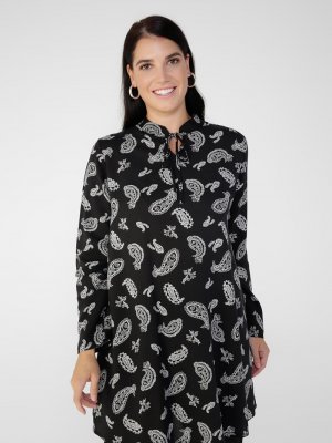 Alia Siyah Beyaz Büyük Beden Doğal Kumaşlı Yakası Bağcıklı Desenli Tunik