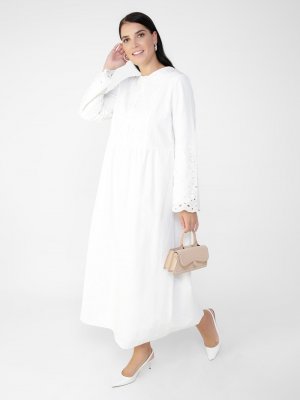 Alia Ekru Büyük Beden Nakış Detaylı Elbise