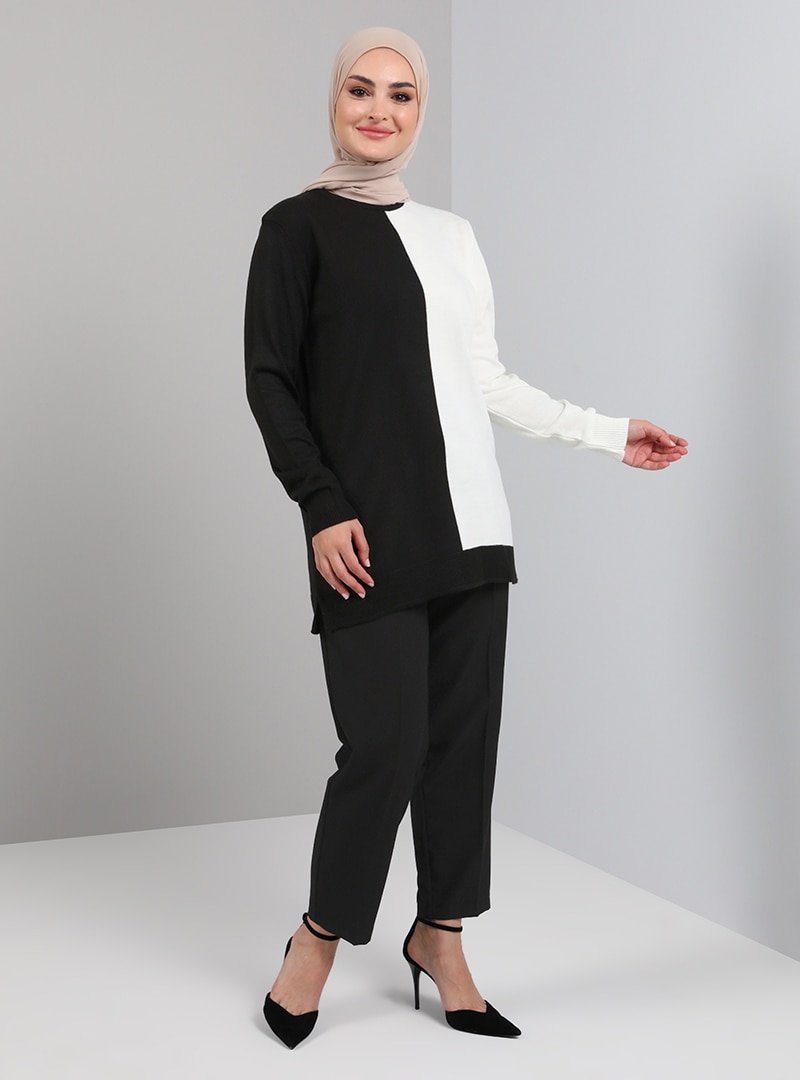 Tavin Siyah Color Blok Bisiklet Yaka Triko Tunik