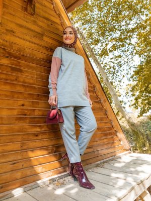Tavin Gri Kolu Renk Detaylı Boğazlı Triko Tunik