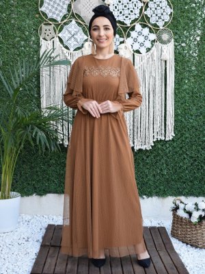MAS&DESİGN Tarçın Güpür İşlemeli Volanlı Abiye Elbise