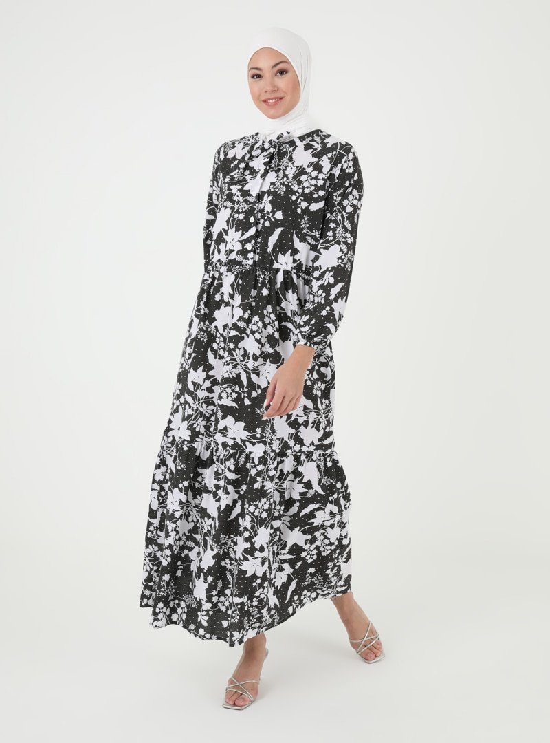 İLMEK TRİKO Siyah Desenli Düğme Detaylı Elbise