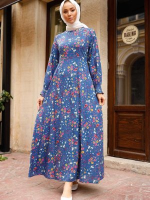 In Style İndigo Kolu Büzgülü Kasımpatı Desen Elbise