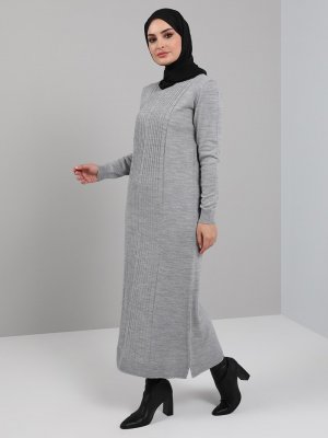 Tavin Koyu Gri Bisiklet Yaka Örgü Detaylı Triko Elbise