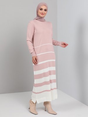 Tavin Pudra Bisiklet Yaka Çizgi Detaylı Triko Elbise