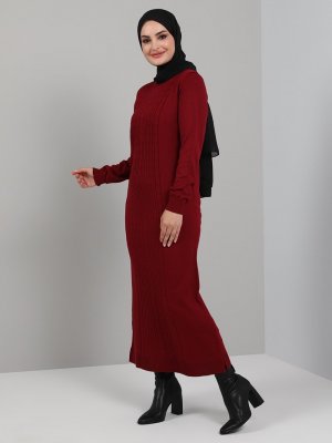 Tavin Bordo Bisiklet Yaka Örgü Detaylı Triko Elbise