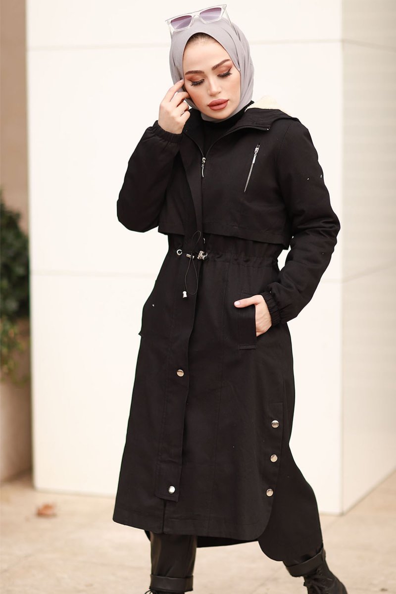 In Style Siyah Gabardin Kumaşlı Beli Büzgülü Kaban