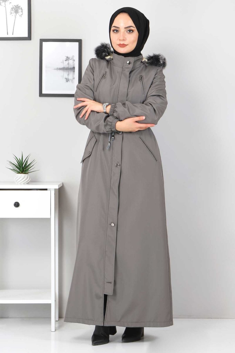 Tesettür Dünyası Beli Bağcıklı Kapaklı Mont Gri