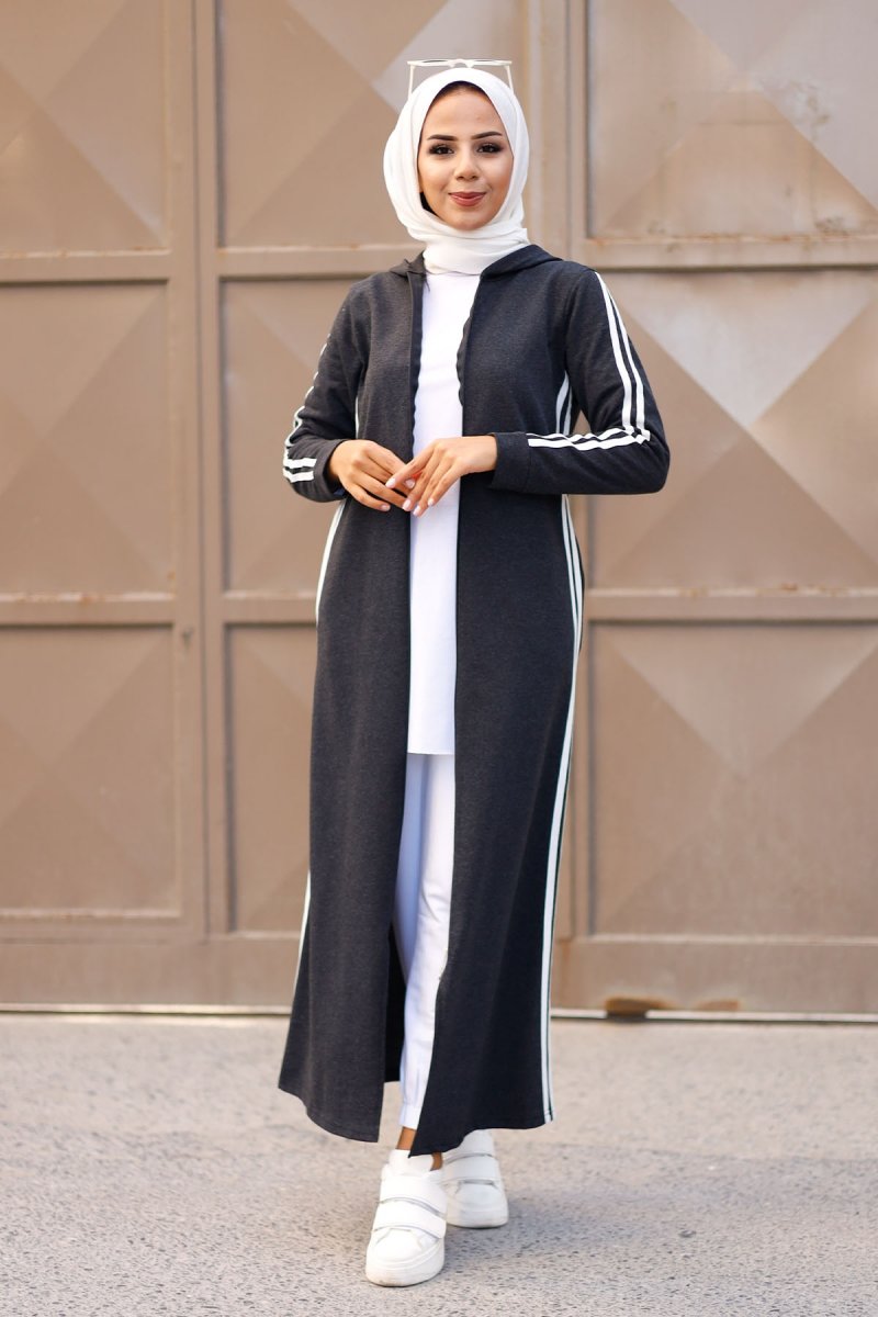 In Style Antrasit Çift Çizgi Fermuarlı Kapüşonlu Ferace