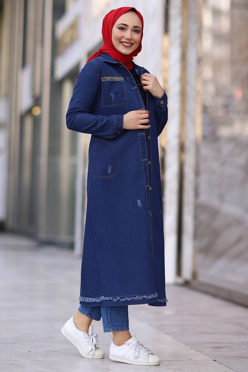 In Style Mavi Cepleri Pul Detaylı Uzun Kot Ceket