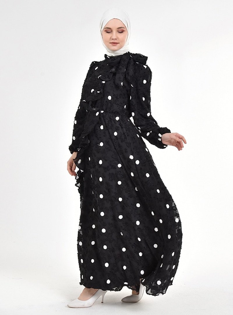 Picolina Siyah Puantiye Beyaz Fırfırlı Şifon Elbise