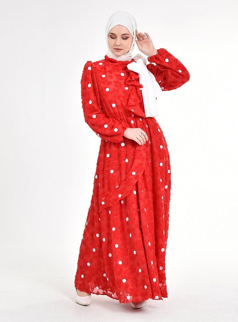 Picolina Kırmızı Puantiye Beyaz Fırfırlı Şifon Elbise