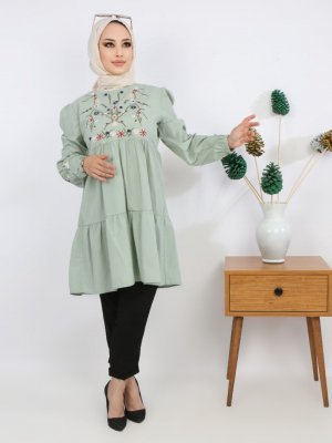 Pink Lady`s Açık Mint Göğüs Ve Kolları Nakışlı Katlı Tunik