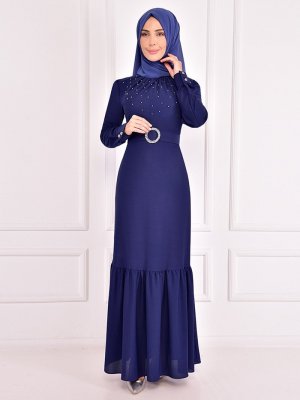AYŞE MELEK TASARIM İndigo Yakası Büzgülü İnci Detaylı Abiye Elbise