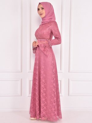 AYŞE MELEK TASARIM Gül Kurusu Boncuk İşlemeli Dantelli Abiye Elbise