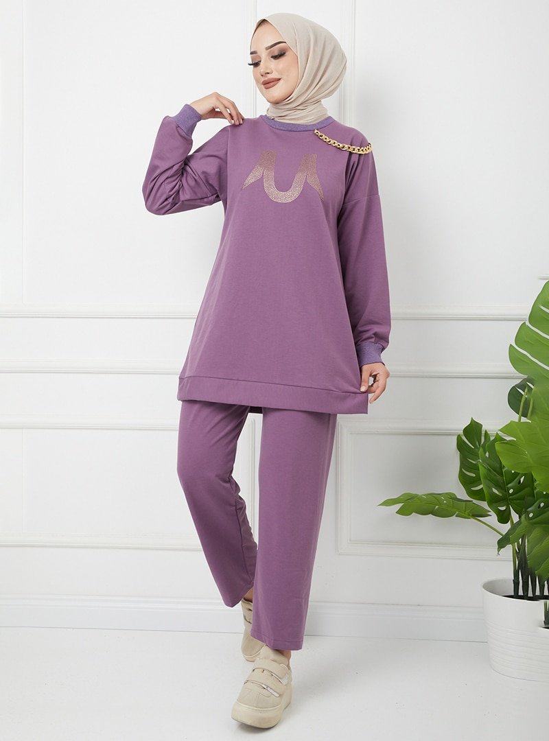 OLCAY TEKSTİL Lila Önü Taş Ve Zincir Detaylı İkili Örme Eşofman Takım