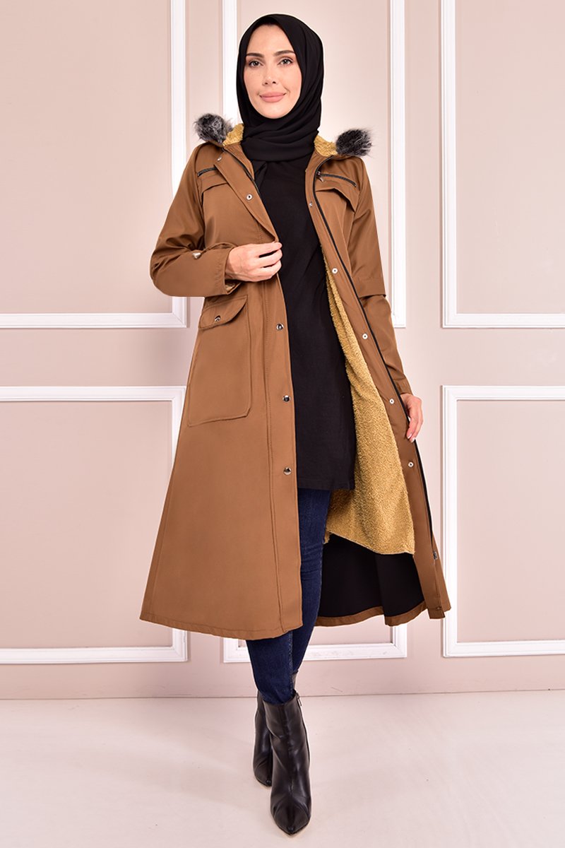 Moda Merve Kapüşonlu Kaban Taba