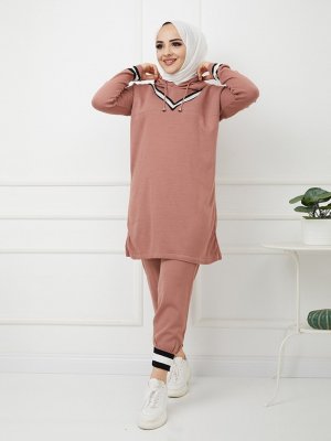 SAHRA BUTİK Kurusu Gül Kapüşonlu Pantolonlu İkili Triko Takım