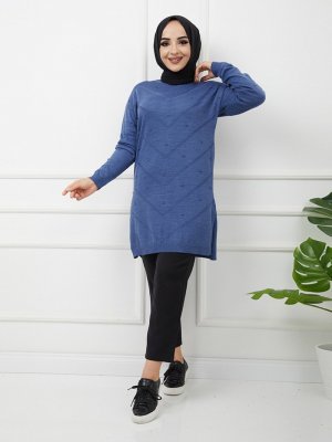 SAHRA BUTİK İndigo Kendinden V Desenli Kabartmalı Triko Tunik