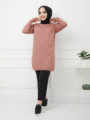 SAHRA BUTİK Gül Kendinden V Desenli Kabartmalı Triko Tunik
