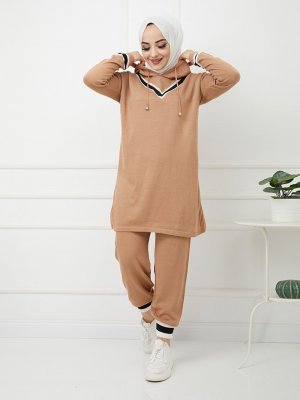 SAHRA BUTİK Bej Kapüşonlu Pantolonlu İkili Triko Takım