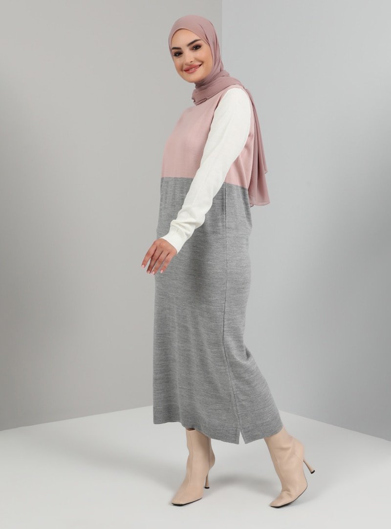 Tavin Pudra Bisiklet Yaka Color Blok Triko Elbise